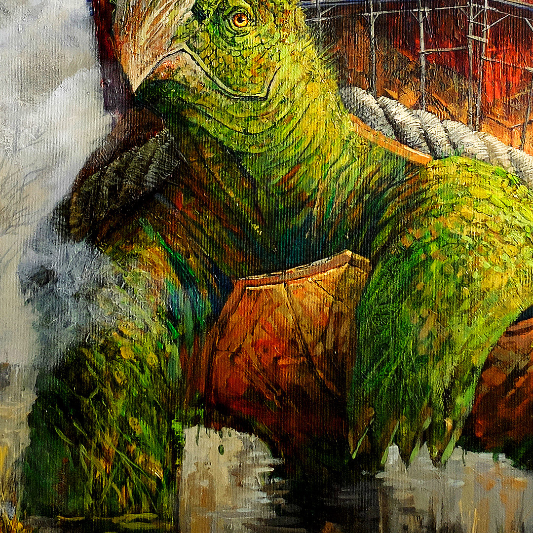 Coś się zaczyna. Ona stoi w drzwiach – jeszcze w cieniu, ale już z twarzą w słońcu. W bluzie z uszami zebry, w czerwonych okularach. Gotowa, by ruszyć dalej. Coś powiedzieć, coś pokazać całemu światu. To moment zatrzymany pomiędzy – jeszcze wewnątrz, już prawie na zewnątrz. Ile razy sami byliśmy dokładnie tam? „Tupak” to portret osoby bliskiej artyście. W całej serii Human Factor symboliczne kostiumy i rekwizyty mają znaczenie – tutaj zebra to znak stadności, przynależności, ale i siły własnego głosu.
